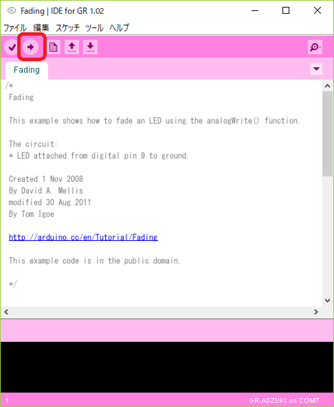 Launch the IDE for GR and select “Fading” from the menu [File] -> [Sketch Example] -> [03.Analog].